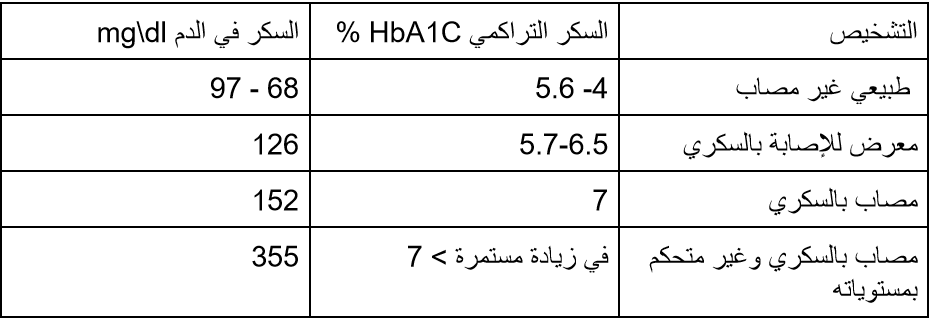 - أما إذا كان المعدل أكبر من 6.5% فهو مريض بداء السكري، وينصح بالتوجه إلى الطبيب المعالج.